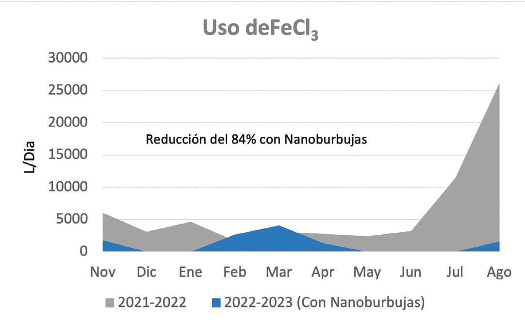 Después de la instalación del generador de Moleaer, las quejas por olores fueron significativamente menores durante los meses de verano, e incluso se detuvieron por completo durante el resto del año. Además, el consumo diario promedio de férrico durante el período de aplicación de nanoburbujas (del 25 de noviembre de 2022 al 31 de agosto de 2023) fue de 34 L/d, mientras que para el mismo período anterior (del 25 de noviembre de 2021 al 31 de agosto de 2022) fue de 212 L/d, es decir, una reducción del 84% en el uso de químicos. También resolvieron sus problemas de olores con poco o casi ningún químico, y además, el personal de la PTAR observó más beneficios de tratamiento aguas abajo de los clarificadores primarios.